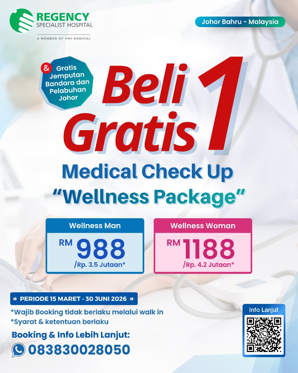Regency Specialist Hospital menyediakan promo BELI 1 GRATIS 1 UNTUK SETIAP PEMBELIAN PAKET MEDICAL CHECK-UP (WELLNESS MAN & WELLNESS WOMAN) khusus pasien Indonesia yang mendaftar melalui mahkotaregency.id